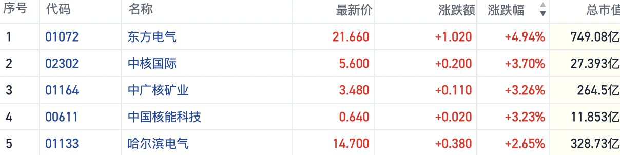 截至发稿,东方电气(01072.HK)涨约5%,中核国际(02302.HK)涨近4%,中广核矿业(01164.HK)等公司跟涨。