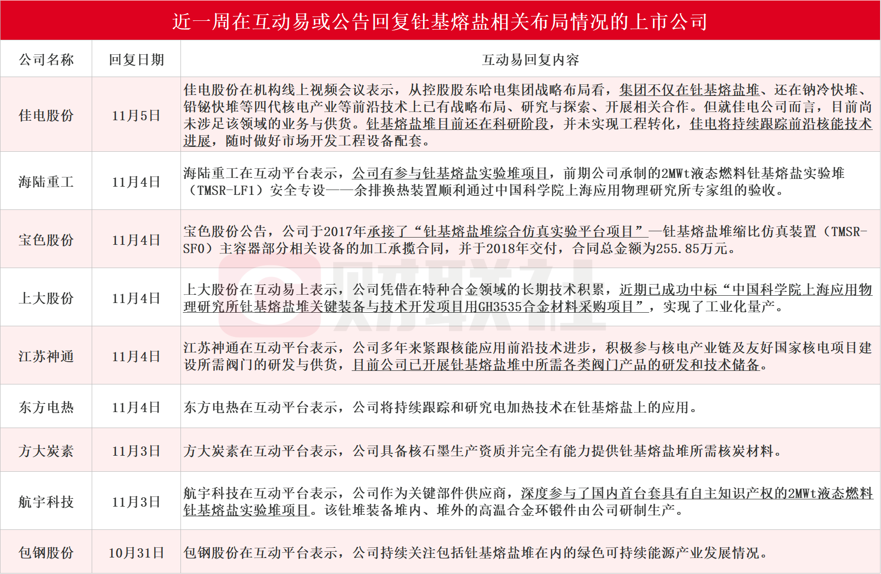 钍基熔盐龙头海陆重工三连板 近10家A股上市公司互动易或公告回应相关业务情况
