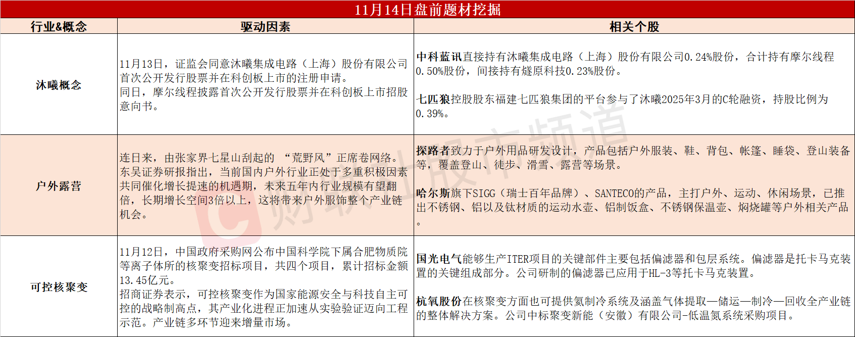 【盘前题材挖掘】①沐曦、摩尔线程传来IPO新进展,相关参股企业有望直接受益。②荒野求生赛事引爆户外市场,机构称行业正处于增长提速的机遇期。③中科院核聚变研究单位启动招标,产业链多环节迎来增量。
