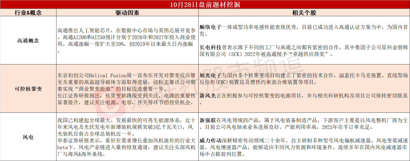 【盘前题材挖掘】①一度暴涨20%!高通入局AI芯片市场,相关合作伙伴有望站上风口。②核聚变领域再迎里程碑式突破,产业链投资机遇凸显。③中国风光发电领跑全球,机构称风电产业链有望盈利修复。