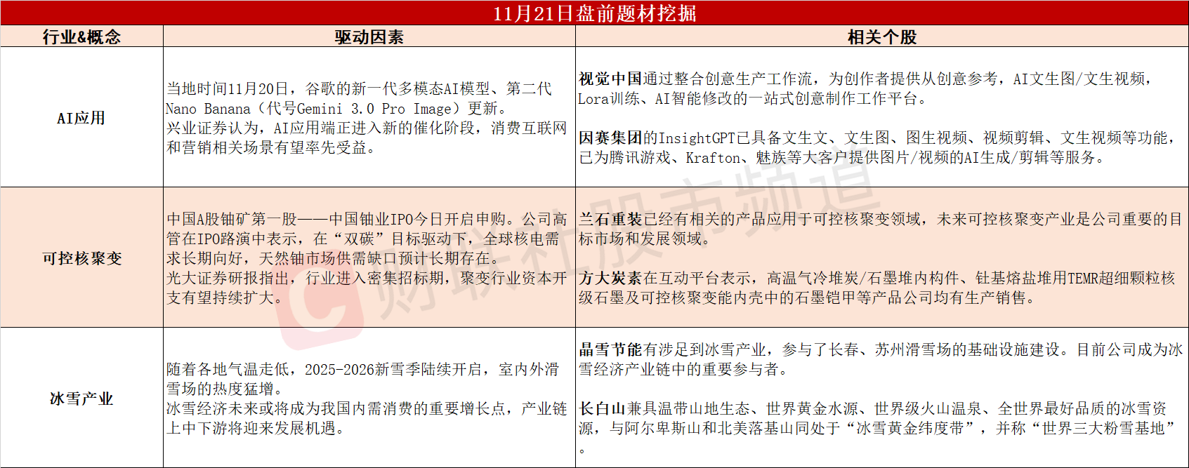 【盘前题材挖掘】①谷歌新版Nano Banana上线,AI应用端进入全新催化阶段。②铀矿第一股今日开启申购,全球核电需求有望长期向好。③我国内需消费的重要增长点,冰雪经济有望迎来发展机遇。