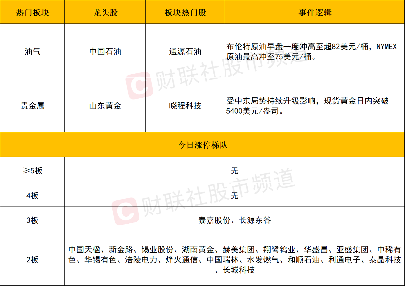 贵金属同样走强,晓程科技20cm涨停,西部黄金、四川黄金、湖南黄金、招金黄金、赤峰黄金、中金黄金等涨停。消息面上,受中东局势持续升级影响,现货黄金日内突破5400美元/盎司。
