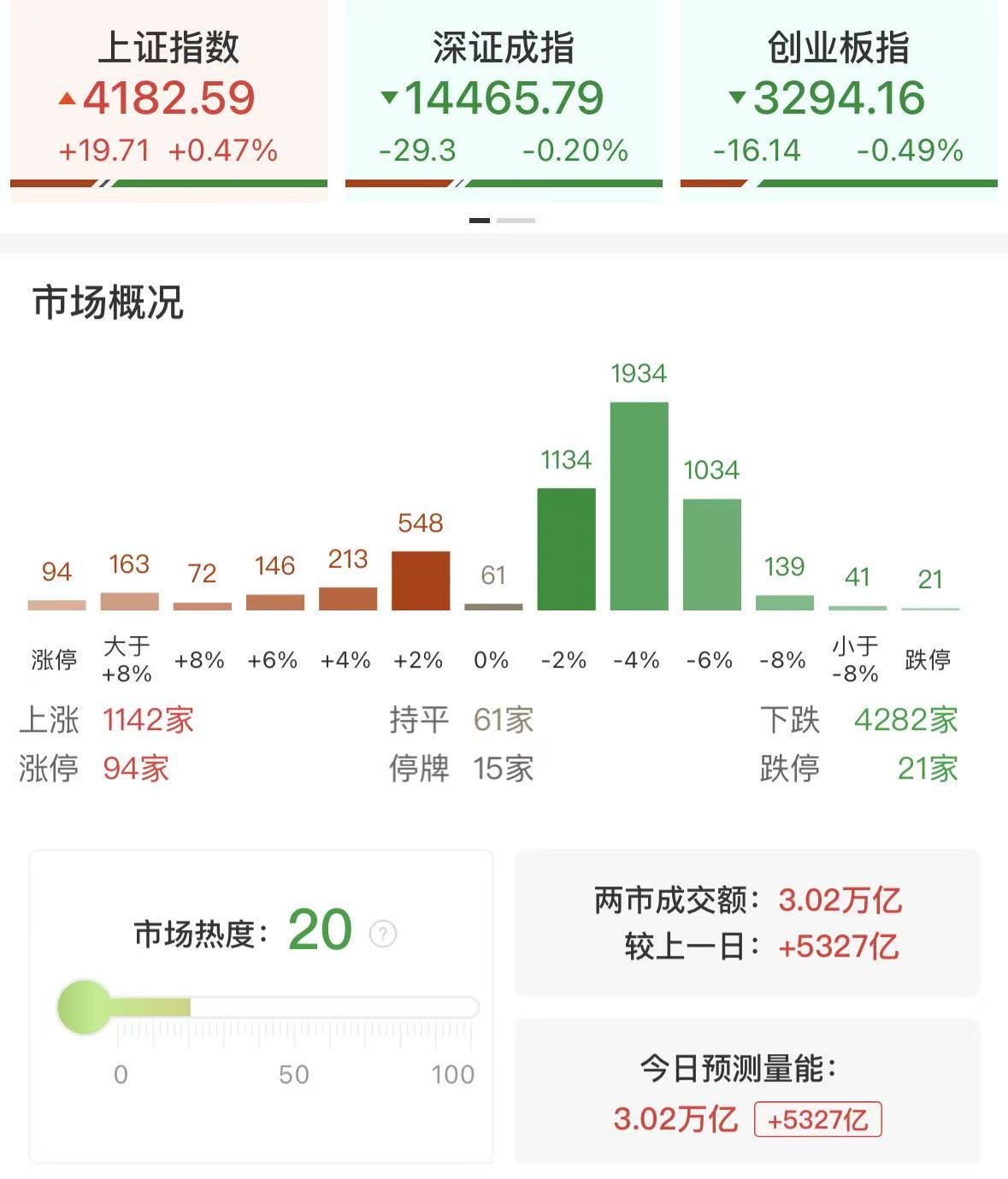 3月2日讯,三大指数涨跌不一,沪指低开高走涨0.47%,创业板指冲高回落,盘中一度翻红。黄白线明显分化。沪深两市成交额3.02万亿,较上一个交易日放量5327亿。盘面上,全市场超4200只个股下跌。从板块来看,油气股全线爆发,近二十只成分股涨停,洲际油气5天3板,中国石油、准油股份、石化油服、山东墨龙、潜能恒信涨停。贵金属概念集体走强,晓程科技20cm涨停,西部黄金、四川黄金等多股涨停。化工板块反复活跃,金牛化工走出11天5板,金瑞矿业、红星发展、兴化股份涨停。港口航运概念表现活跃,中远海能、南京港、招商南油涨停。煤炭板块午后拉升,中煤能源触及涨停创17年新高。下跌方面,光伏设备概念集体下挫,双良节能一字跌停。截至收盘,沪指涨0.47%,深成指跌0.2%,创业板指跌0.49%。