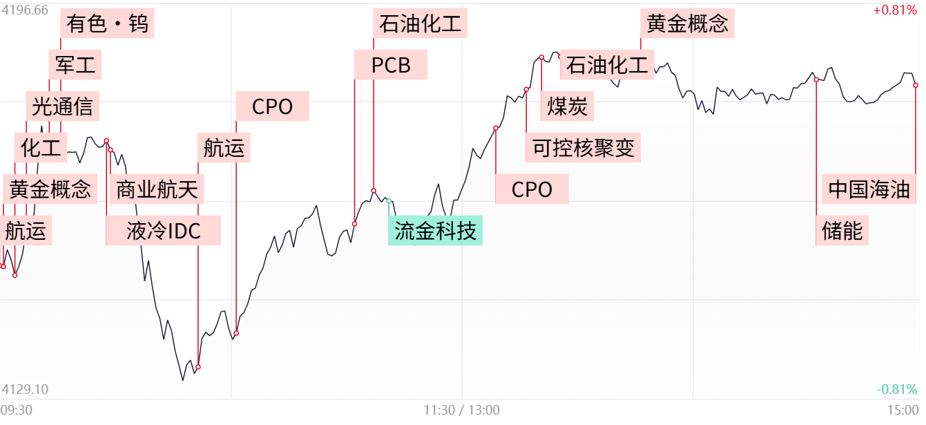 个股层面来看,今日市场呈现割裂态势,一方面逾百股涨停或涨超10%,另一方面超4200只个股收跌。其中资源类周期股集中爆发,油气股几乎全线涨停,其中“三桶油”作为核心权重首次收盘集体涨停。贵金属方向,市值超千亿的山东黄金、中金黄金双双涨停,而湖南黄金2连板。化工股反复活跃金牛化工走出11天5板。港口航运概念同样表现量能,招商轮船7天4板,中远海能、招商南油等涨停。此外,部分算力硬件方向同样获得资金回流,中际旭创、新易盛双双放量涨超5%。