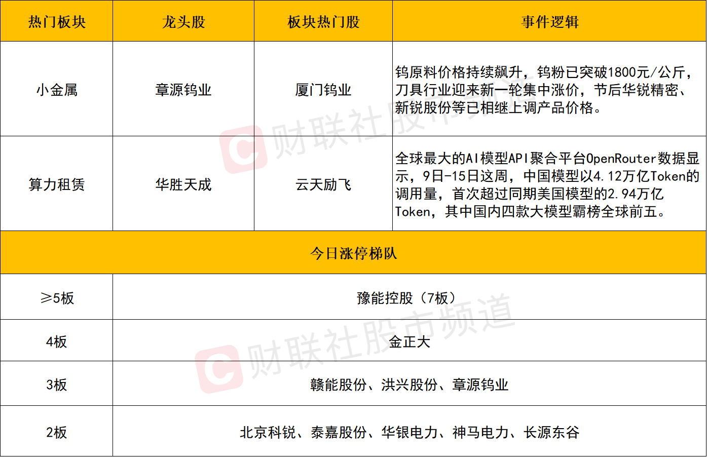 板块上,小金属再度走强,东方锆业、翔鹭钨业、厦门钨业、中钨高新、金钼股份、章源钨业、锡业股份等涨停。消息面上,钨原料价格持续飙升,钨粉已突破1800元/公斤,刀具行业迎来新一轮集中涨价,节后华锐精密、新锐股份等已相继上调产品价格。