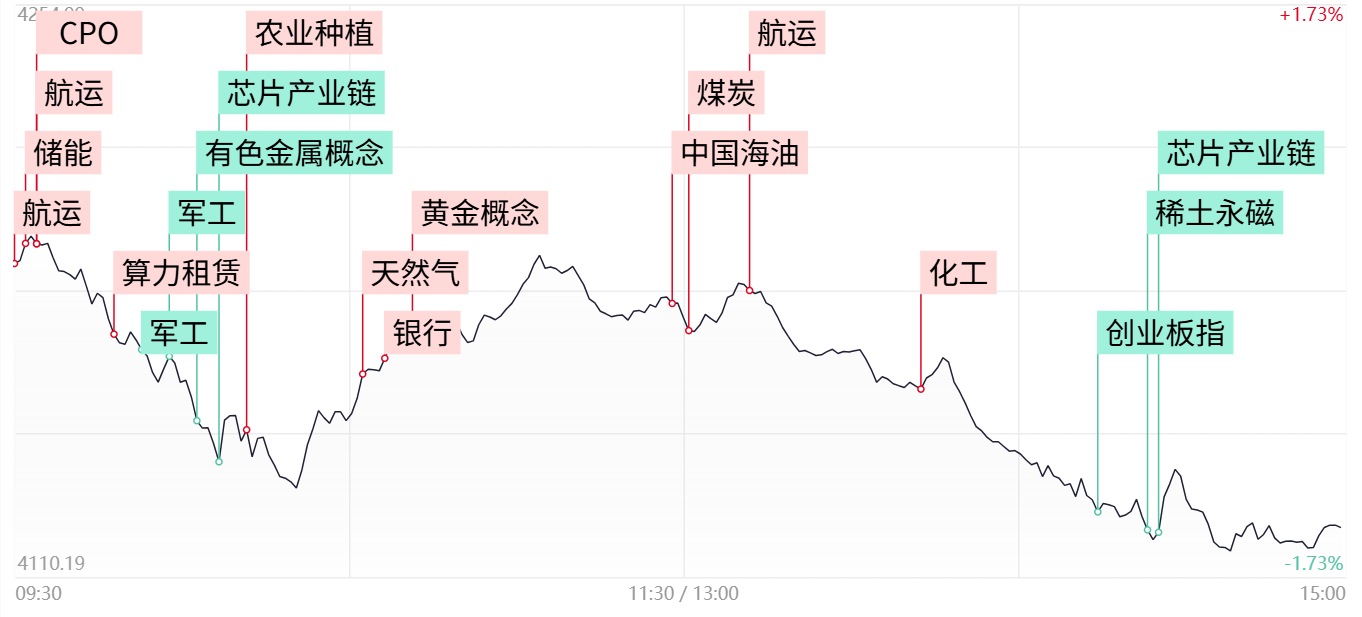 今日市场全天震荡走低,三大指数均以放量长阴报收,此前震荡向上的结构遭到完全破坏,若短线无法快速迎来强力反弹,指数或仍存一定向下调整空间。沪指维度后续可重点留意4050±20(布林下轨与季线)附近的支撑力度,只要不将其有效跌破,中期仍能以区间震荡结构看待。而从盘面维度来看,此前的期热门赛道如贵金属、有色、算力、电网设备等均跌幅居前,上述热点中核心标的强弱或可视为短线情绪的风向标,若始终无法迎来资金修复的话,便意味短线风偏依旧较低,不利于市场的止跌企稳。