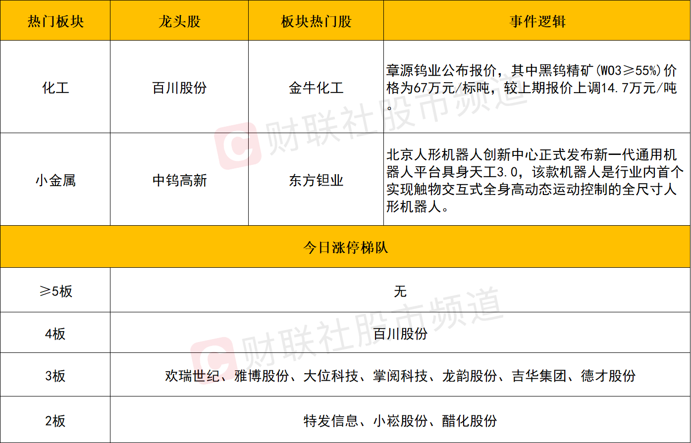 化工板块近期反复活跃,百川股份11天8板,吉华集团5天4板,泰和新材、醋化股份、华尔泰、金牛化工涨停。
