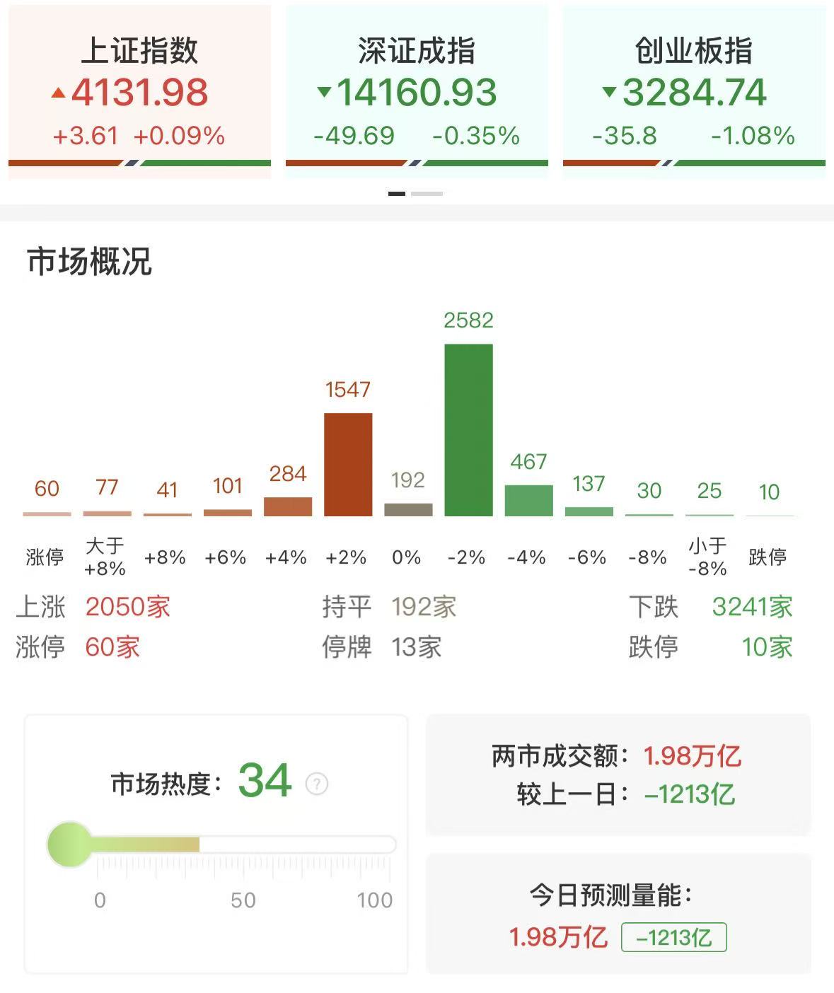 【每日收评】创业板指震荡走低跌超1%,两市成交额不足2万亿,周期股逆势走强