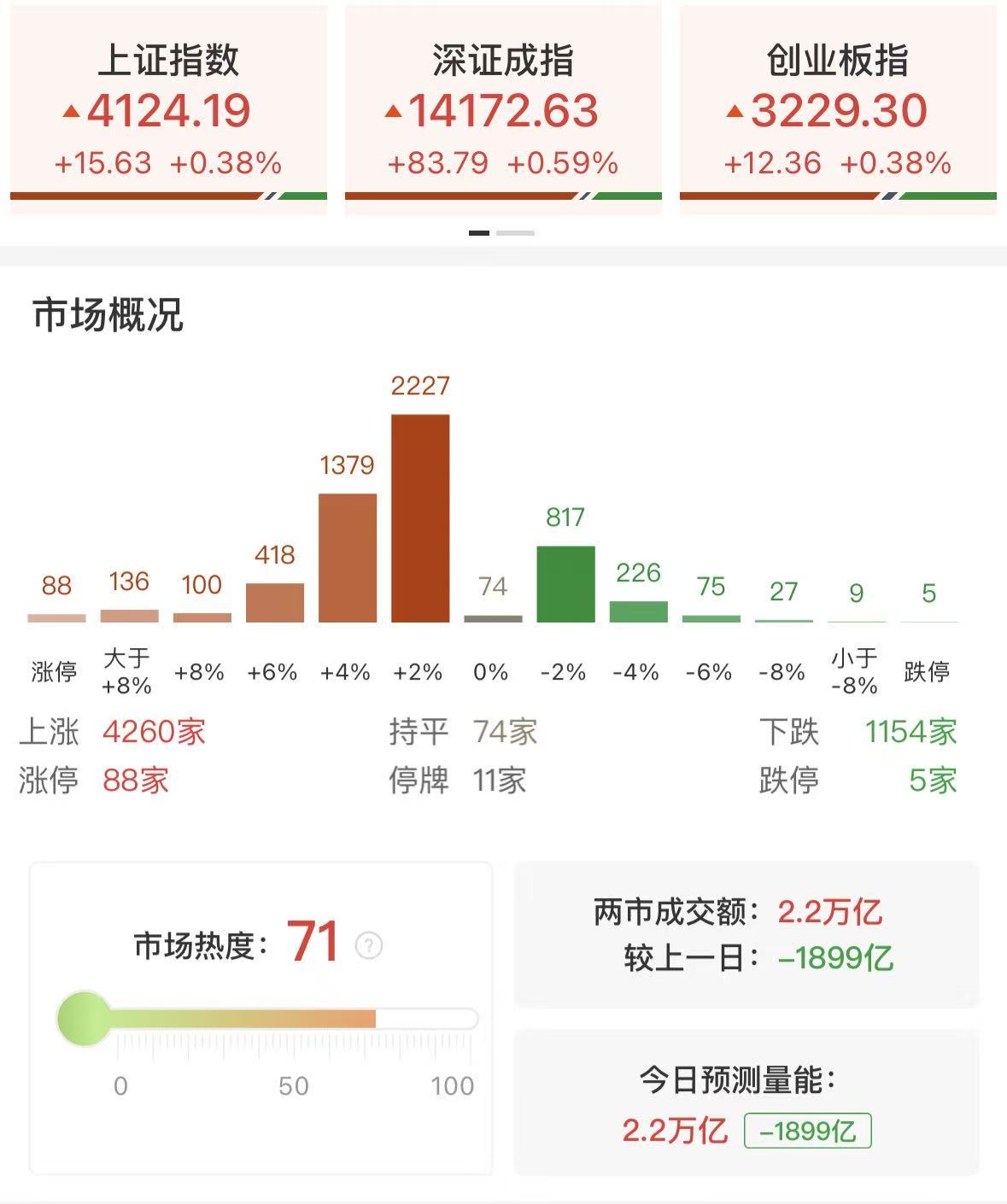 3月6日讯,沪指、深成指低开高走,创业板指冲高回落,此前一度涨近1%,黄白线明显分化,微盘股指数涨超3%。沪深两市成交额2.2万亿,较上一个交易日缩量1899亿。盘面上,市场热点快速轮动,全市场超4200只个股上涨。从板块来看,化工板块集体拉升,十余只成分股涨停,金牛化工5天3板,金正大、金浦钛业、红宝丽、红墙股份涨停。电网设备概念反复活跃,顺钠股份、汉缆股份双双3连板。燃气轮机概念快速走强,万泽股份、常宝股份涨停。算力租赁概念表现活跃,宁波建工、威星智能双双涨停。下跌方面,油气股表现疲软,石化油服、中曼石油大跌。截至收盘,沪指涨0.38%,深成指涨0.59%,创业板指涨0.38%。