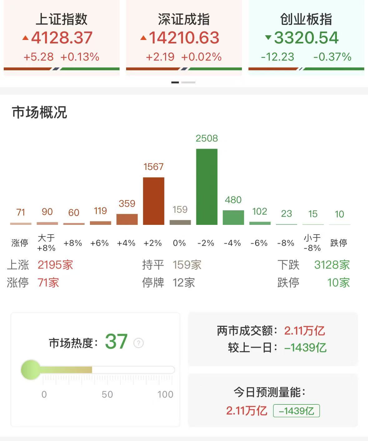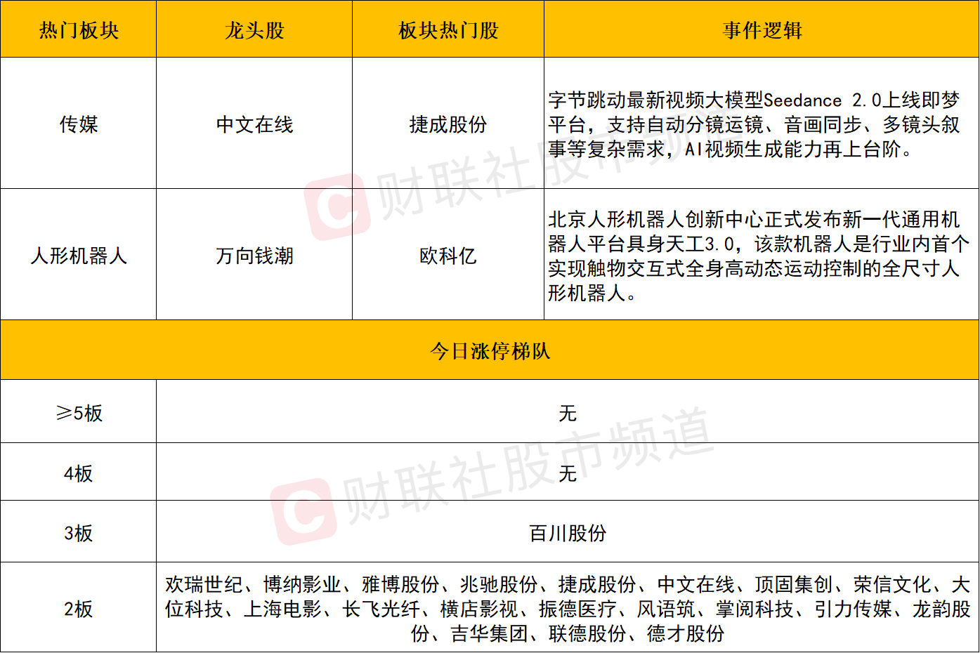 2月10日讯,市场全天窄幅震荡,三大指数涨跌不一,科创50指数涨近1%。沪深两市成交额2.11万亿,较上一个交易日缩量1439亿。盘面上,全市场超3100只个股下跌。从板块来看,传媒板块持续全天领涨,万达电影、读客文化、捷成股份、荣信文化、横店影视、上海电影、博纳影业、中国电影、光线传媒等多股涨停。人形机器人概念表现活跃,万向钱潮涨停。PCB概念震荡拉升,南亚新材、宏和科技双双创历史新高。下跌方面,商业航天概念下挫,顺灏股份触及跌停。大消费板块震荡下跌,杭州解百跌停。截至收盘,沪指涨0.13%,深成指涨0.02%,创业板指跌0.37%。