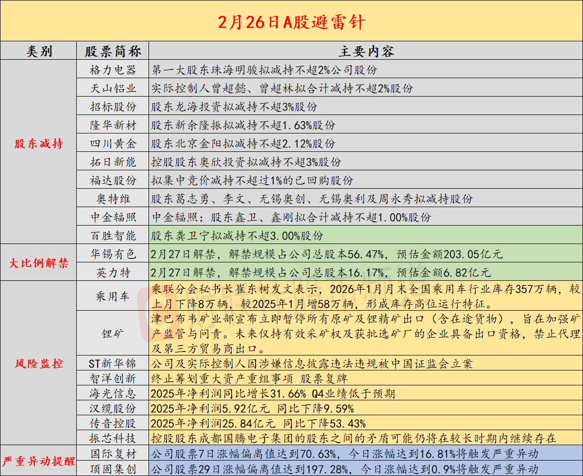 导读:2月26日投资避雷针近日,A股及海外市场潜在风险事件如下。国内经济信息方面包括:1)乘联分会秘书长崔东树发文表示,2026年1月月末全国乘用车行业形成库存高位运行特征;2)多位知情人士表示,魅族手机业务已经实质性停摆,或于2026年3月正式退市;公司方面重点关注包括:1)格力电器:第一大股东珠海明骏拟减持不超2%公司股份;2)ST新华锦:公司及实际控制人因涉嫌信息披露违法违规被中国证监会立案;海外市场重点关注包括:1)美国贸易代表贾米森·格里尔表示,美国对部分国家加征的“全球进口关税”税率将从新近实施的10%升至15%或更高;2)津巴布韦矿业部宣布立即暂停所有原矿及锂精矿出口。