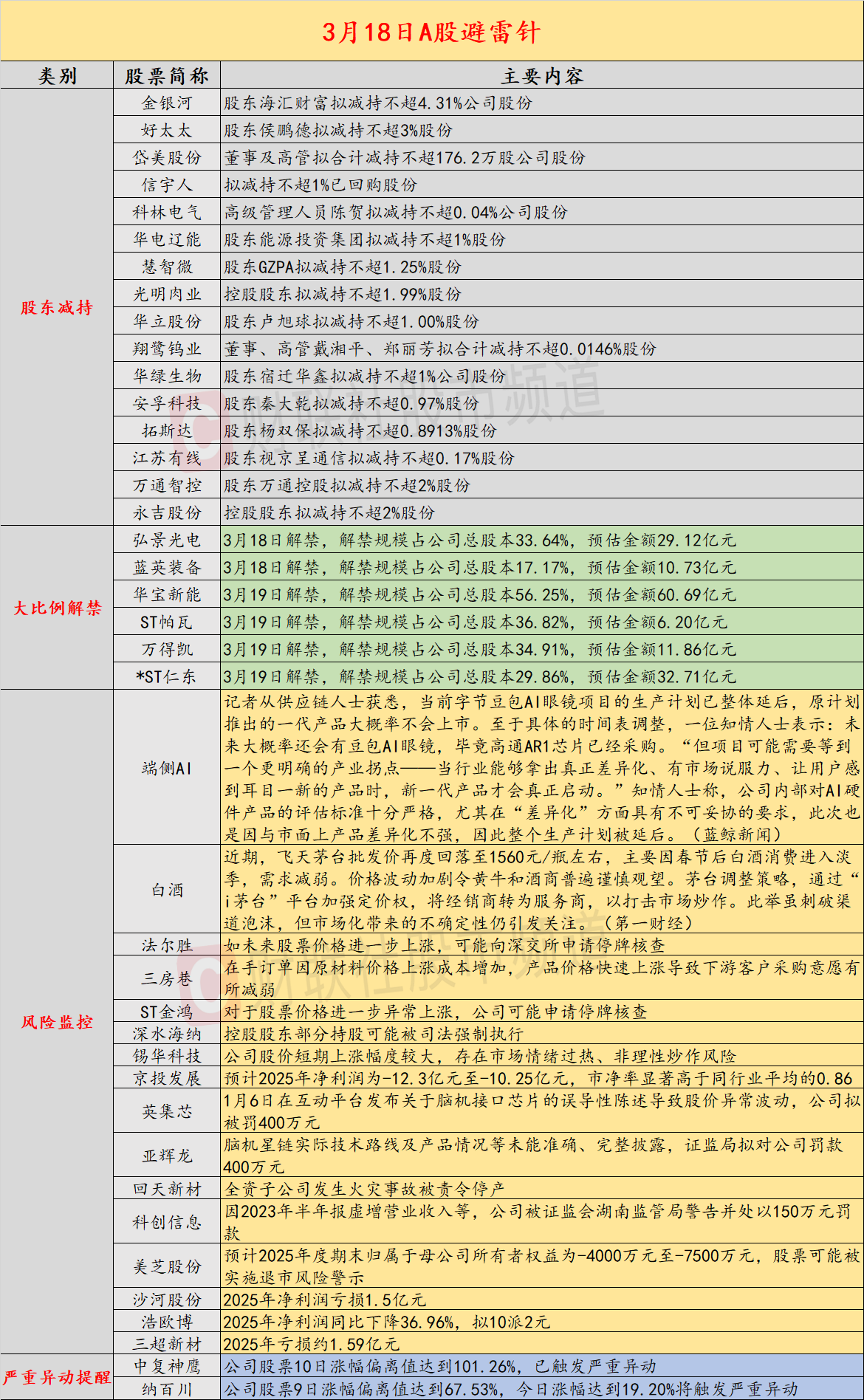 导读:3月18日投资避雷针,近日A股及海外市场潜在风险事件如下。国内经济信息方面包括:1)字节原计划推出的一代豆包AI眼镜或不会上市;2)飞天茅台批发价再度回落至1560元/瓶左右;公司方面重点关注包括:1)4连板法尔胜表示,如未来股票价格进一步上涨,可能向深交所申请停牌核查;2)4连板三房巷公告,在手订单因原材料价格上涨成本增加,产品价格快速上涨导致下游客户采购意愿有所减弱;海外市场重点关注包括:1)伊朗最高领袖驳回与美国议和提案,坚持击败美以并索赔;2)波斯湾油气生产端首次遇袭,阿联酋大型天然气田遭无人机袭击后暂停作业。