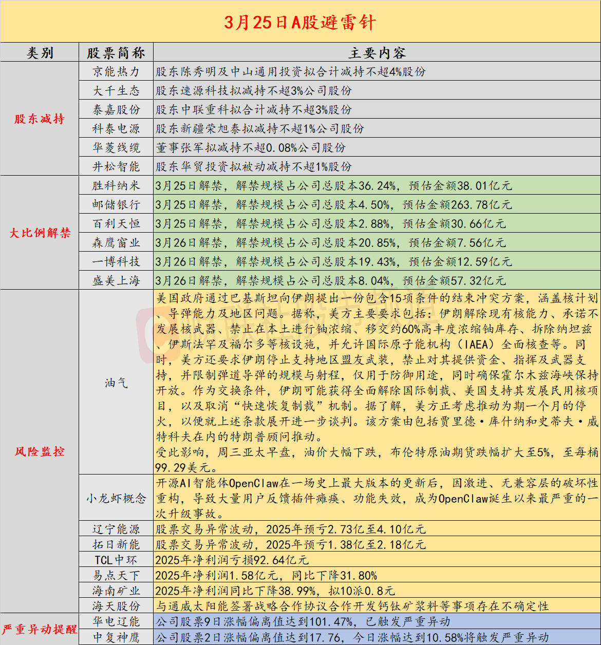 导读:3月25日投资避雷针,近日A股及海外市场潜在风险事件如下。国内经济信息方面包括:1)地缘缓和预期释放,原油期货大幅回落调整;2)硅片价格重心窄幅下移;公司方面重点关注包括:1)2连板辽宁能源公告,股票交易异常波动,2025年预亏2.73亿至4.10亿元;2)2连板拓日新能公告,股票交易异常波动,2025年预亏1.38亿至2.18亿元;海外市场重点关注包括:1)美方向伊朗提出含“15项条件”的和谈方案,周三亚太早盘油价大幅下跌;2)OpenClaw重大升级遇挫,激进重构致用户全线报错。