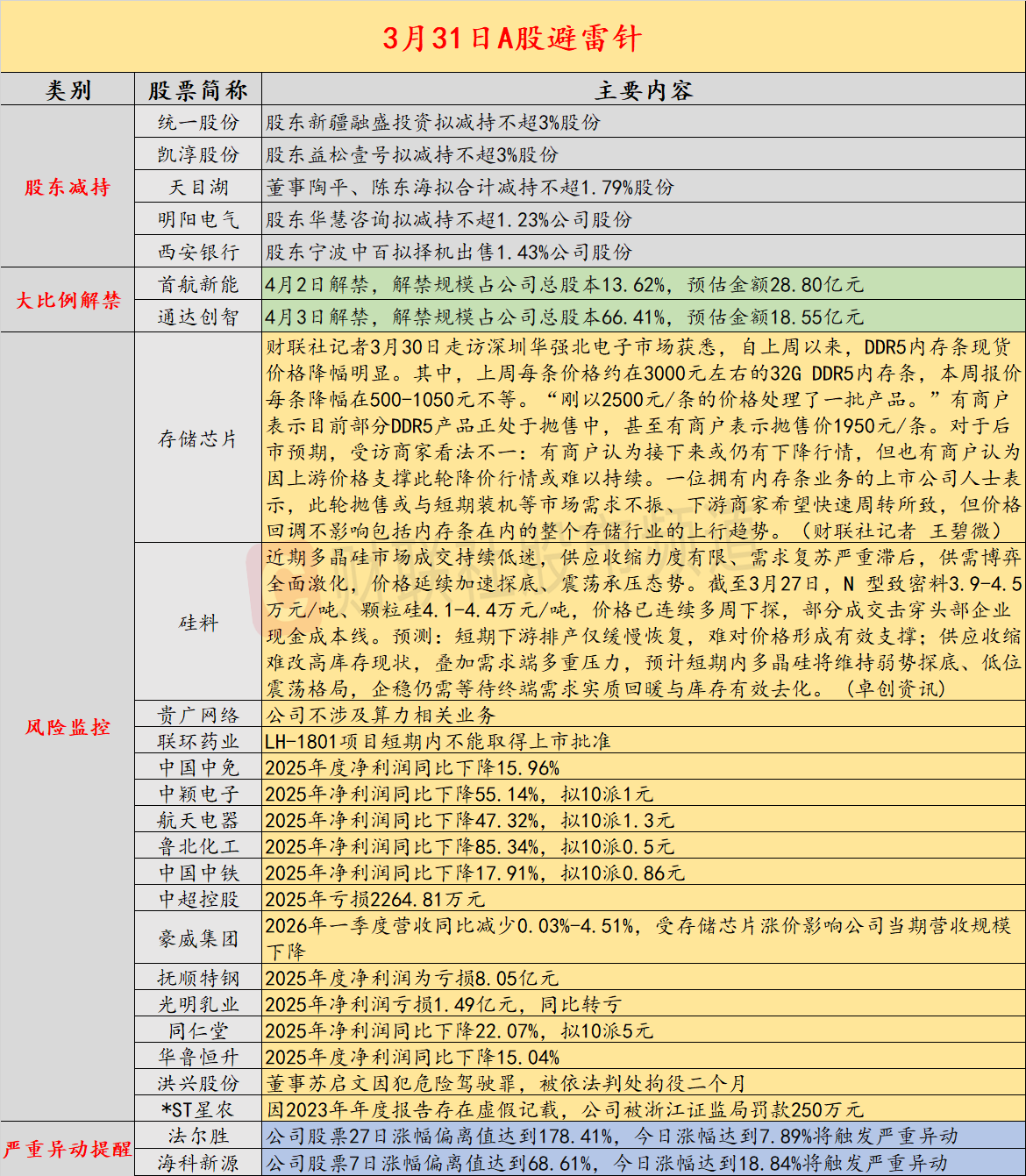 导读:3月31日投资避雷针,近日A股及海外市场潜在风险事件如下。国内经济信息方面包括:1)深圳华强北现内存条抛售行情,有商户称部分型号一周降价近三成;2)多晶硅供需博弈白热化,价格加速探底、弱势难改;公司方面重点关注包括:1)2连板贵广网络表示,公司不涉及算力相关业务;2)2连板联环药业公告,LH-1801项目短期内不能取得上市批准;海外市场重点关注包括:1)美股纳指收跌0.7%,芯片股集体下挫;2)伊朗议会批准对霍尔木兹海峡征收通行费的法案。
