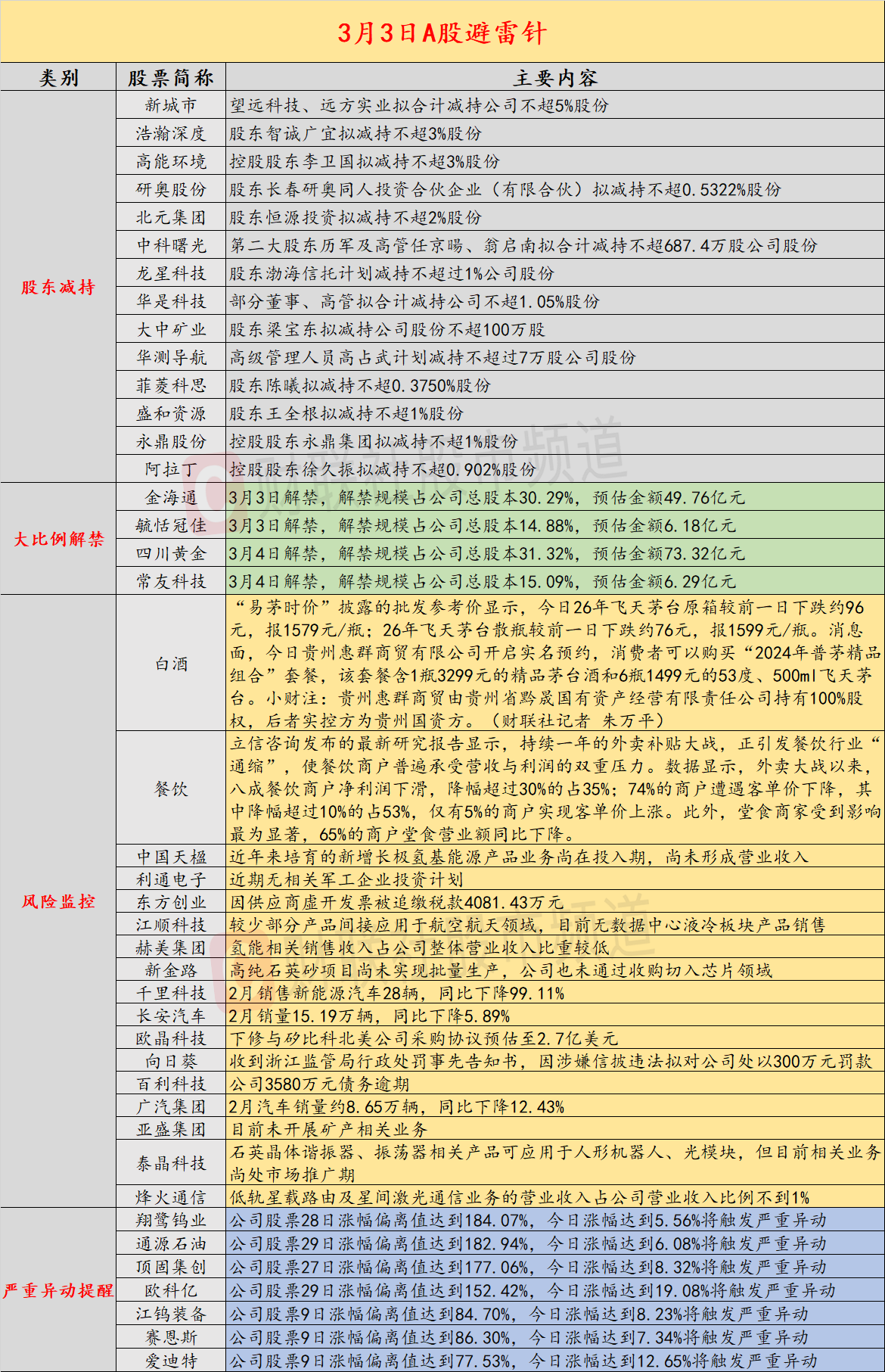导读:3月3日投资避雷针,近日A股及海外市场潜在风险事件如下。国内经济信息方面包括:1)机构研究报告显示,外卖大战引发餐饮价格带“不可逆下降”;2)飞天茅台散瓶批价跌破1600元/瓶;公司方面重点关注包括:1)2连板中国天楹公告,近年来培育的新增长极氢基能源产品业务尚在投入期,尚未形成营业收入;2)2连板利通电子表示,近期无相关军工企业投资计划;海外市场重点关注包括:1)美股三大指数收盘涨跌不一,中概股多数下跌;2)欧洲天然气价格飙升,卡塔尔能源暂停液化天然气生产。