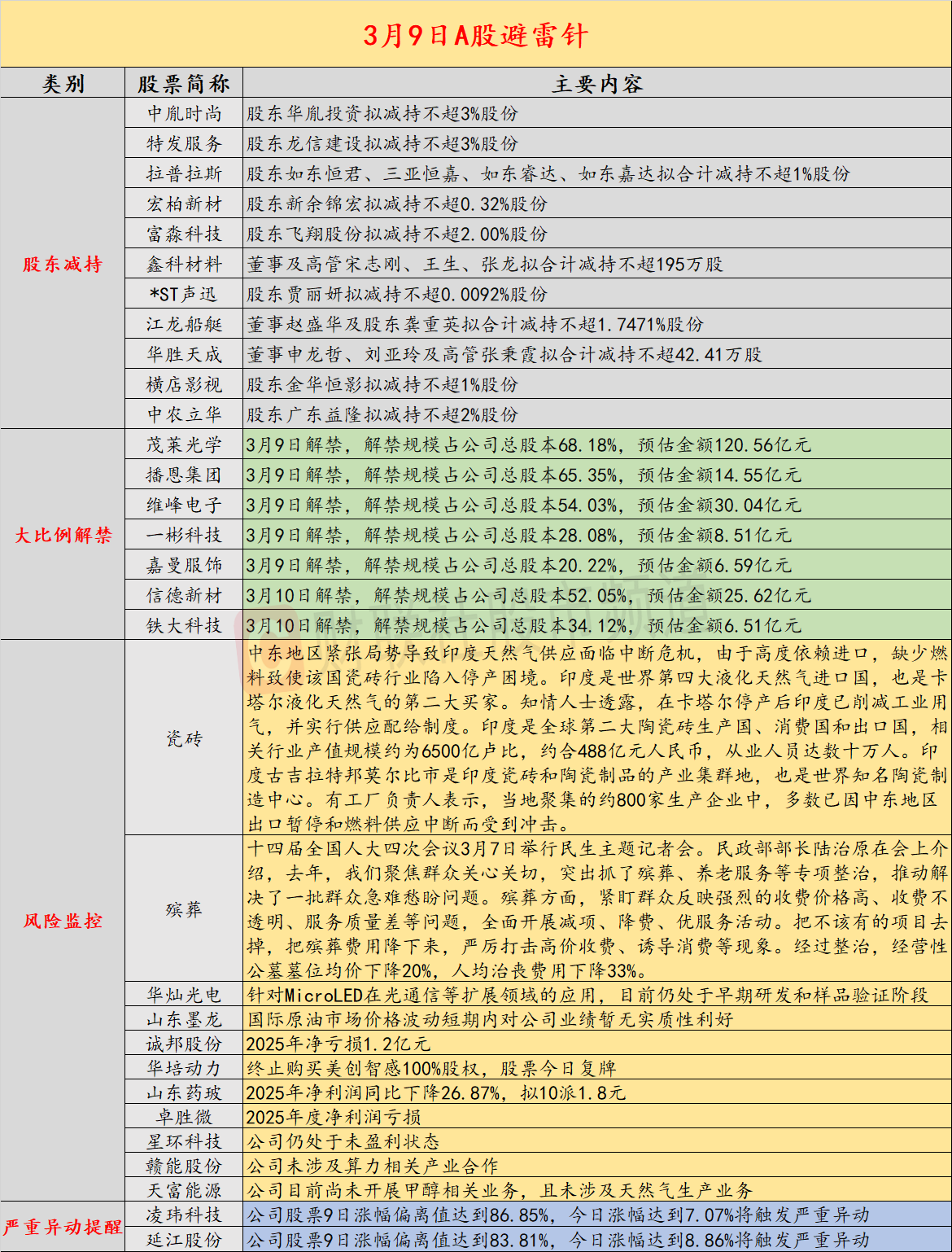 导读:3月9日投资避雷针,近日A股及海外市场潜在风险事件如下。国内经济信息方面包括:1)经整治经营性公墓墓位均价下降20%;2)严查严处蹭热点、炒概念、搞操纵等行为;公司方面重点关注包括:1)华灿光电公告,针对MicroLED在光通信等扩展领域的应用,目前仍处于早期研发和样品验证阶段;2)山东墨龙提示风险,国际原油市场价格波动短期内对公司业绩暂无实质性利好;海外市场重点关注包括:1)哈梅内伊之子接任伊朗最高领袖,特朗普威胁称伊朗新领导人“难长久”;2)伊拉克、卡塔尔等主要产油国相继宣布减产,国际油价一度突破每桶110美元。