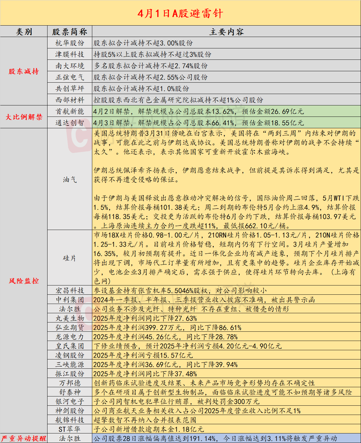 导读:4月1日投资避雷针,近日A股及海外市场潜在风险事件如下。国内经济信息方面包括:1)武汉交警通报“多辆萝卜快跑行驶中突然停车”,初判系统故障;2)硅片价格近期稳中看弱,预期下个月硅片排产将出现下调;公司方面重点关注包括:1)20CM两连板宏昌科技公告,参设基金持有张雪机车5.5046%股权,对公司影响较小;2)中利集团2024年一季报、半年报、三季报营业收入披露不准确,被出具警示函;海外市场重点关注包括:1)伊朗与美国释放出愿意推动冲突解决的信号,国际油价周二回落;2)沃伦·巴菲特表示,股票市场估值仍然缺乏吸引力。