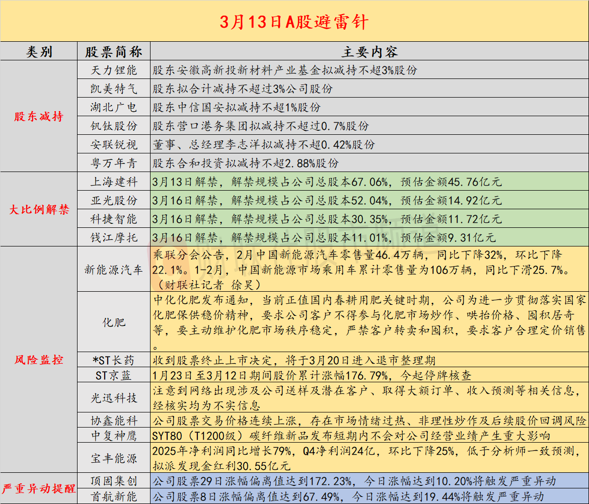 导读:3月13日投资避雷针,近日A股及海外市场潜在风险事件如下。国内经济信息方面包括:1)1-2月中国新能源市场乘用车累计零售量为106万辆,同比下滑25.7%;2)中化化肥发通知要求客户不得参与化肥市场炒作;公司方面重点关注包括:1)ST京蓝1月23日至3月12日期间股价累计涨幅176.79%,今起停牌核查;2)光迅科技表示,注意到网络出现涉及公司送样及潜在客户、取得大额订单、收入预测等相关信息,经核实均为不实信息;海外市场重点关注包括:1)伊最高领袖说继续关闭霍尔木兹海峡;2)美股三大指数集体收跌,芯片股普跌。