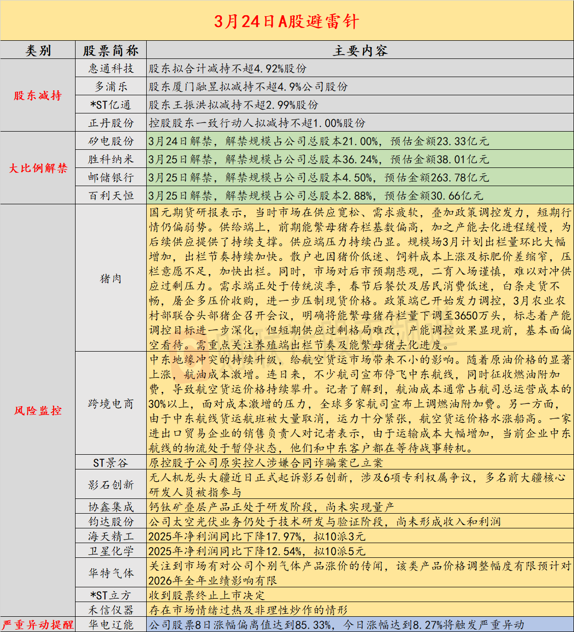 导读:3月24日投资避雷针,近日A股及海外市场潜在风险事件如下。国内经济信息方面包括:1)供需矛盾持续释放,猪价承压运行;2)空运价格暴涨,中东跨境卖家生意停摆;公司方面重点关注包括:1)ST景谷原控股子公司原实控人涉嫌合同诈骗案已立案;2)无人机龙头大疆近日正式起诉影石创新,涉及6项专利权属争议,多名前大疆核心研发人员被指参与;海外市场重点关注包括:1)美油、布油收跌超10%;2)特朗普称美伊或在5天内达成协议,但伊朗高级领导层否认与美国进行了谈判。