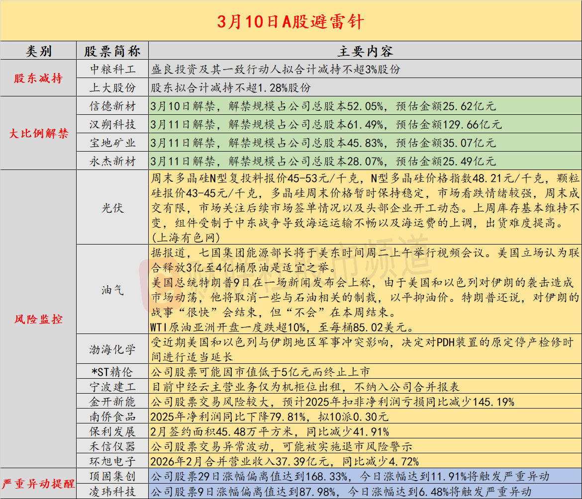 3月10日投资避雷针:特朗普称战争已基本结束 WTI原油亚洲开盘一度跌超10%