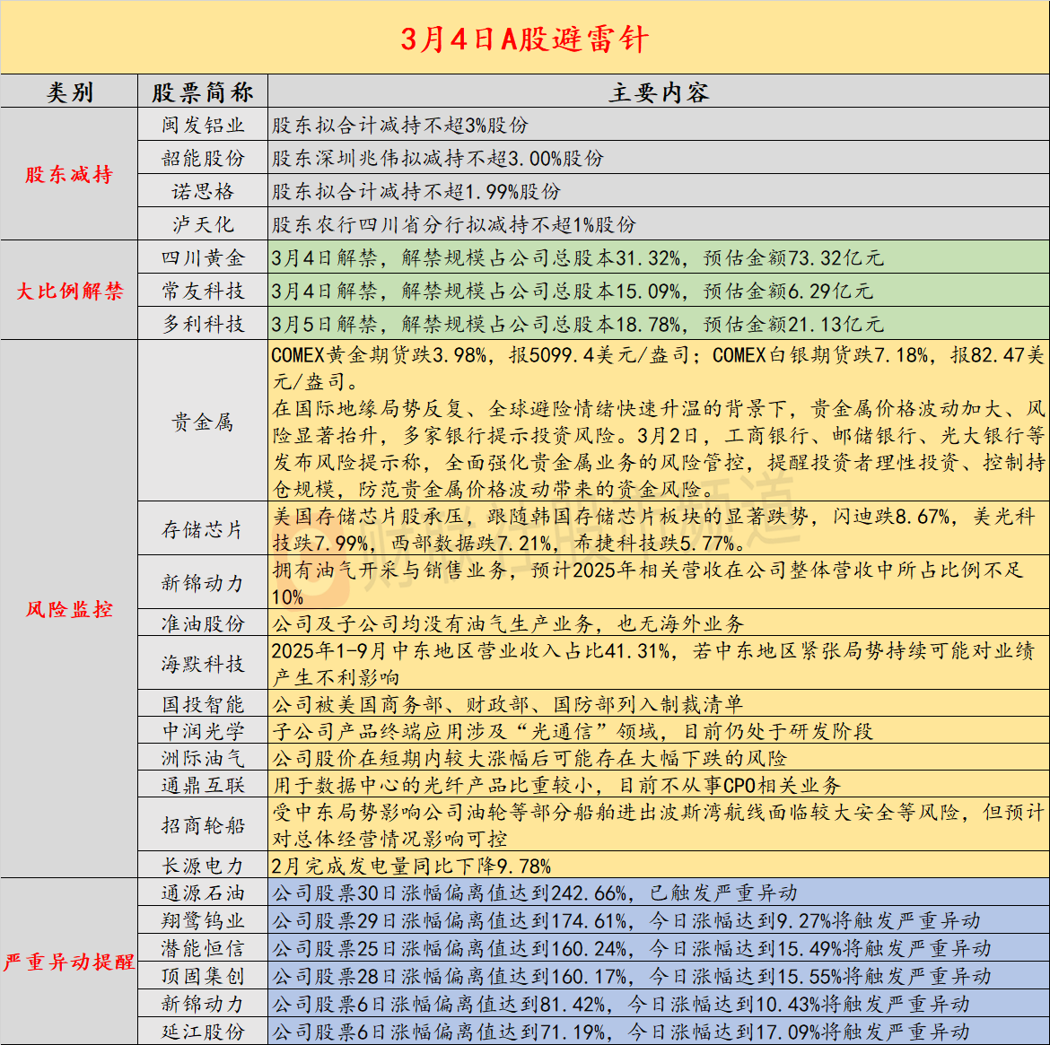 导读:3月4日投资避雷针,近日A股及海外市场潜在风险事件如下。国内经济信息方面包括:1)贵金属市场波动加大,多家银行提示投资风险;2)上期能源所调整原油等期货相关合约交易限额;公司方面重点关注包括:1)20CM两连板新锦动力表示,拥有油气开采与销售业务,预计2025年相关营收在公司整体营收中所占比例不足10%;2)两连板准油股份公告,公司及子公司均没有油气生产业务,也无海外业务;海外市场重点关注包括:1)美股三大指数集体收跌,费城半体指数跌4.58%;2)美国国债连续第二日下挫,交易员对美联储降息的预期明显降温。