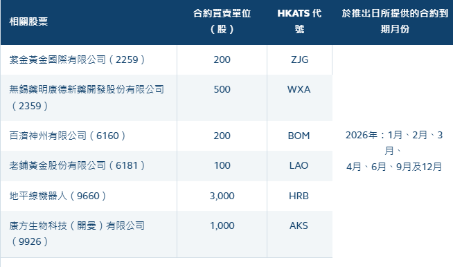 【香港交易所推出新股票期权类别】财联社1月9日电,香港交易所今天宣布,将于2026年1月19日(星期一)推出六只新的股票期权类别,进一步拓展股票期权市场及为投资者提供更丰富的选择。香港交易所的衍生产品市场去年的日均成交量为1,662,751张合约,按年升7%并创出纪录新高。其中,股票期权(包括每月及每周到期合约)是交投最活跃的产品之一,去年的日均成交量亦创出879,831张合约的纪录新高,按年增加22%。