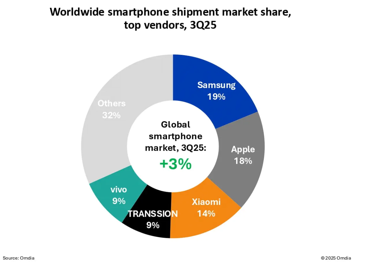 苹果公司iPhone的出货量则同比增长了4%,实现了有史以来最强劲的第三季度销售业绩。由于 iPhone 17系列上市后初期需求强劲,苹果成功占据了全球18%的市场份额。