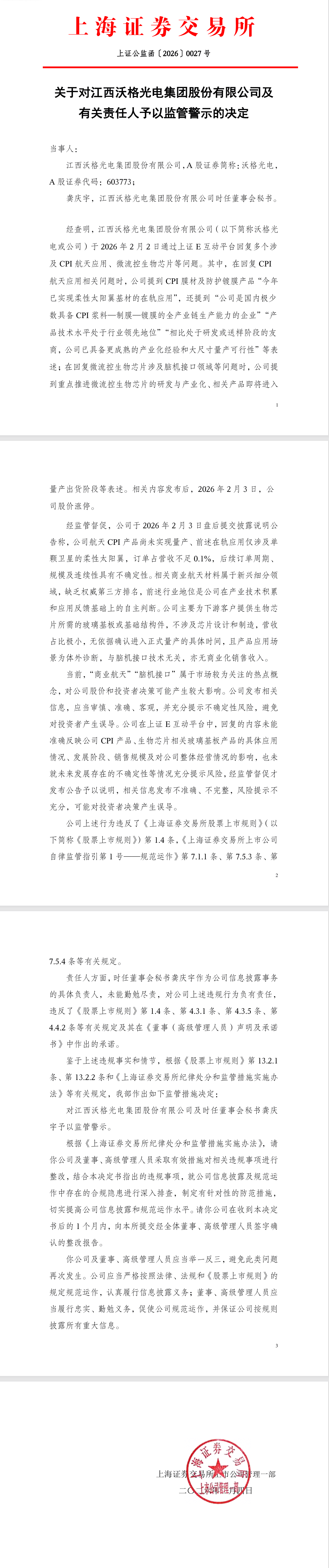 财联社2月4日电,上交所对沃格光电及有关责任人予以监管警示,“商业航天”“脑机接口”相关信息发布不准确、不完整,风险提示不充分,可能对投资者决策产生误导。