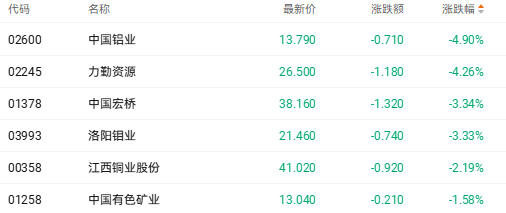 截至午盘,中国铝业(02600.HK)跌4.90%、中国宏桥(01378.HK)跌3.34%、洛阳钼业(03993.HK)跌3.33%。