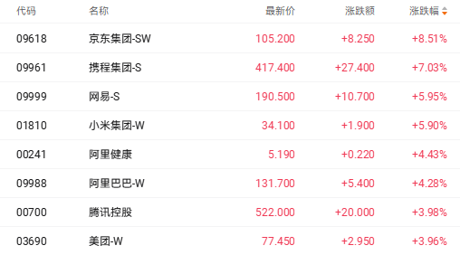 截至午盘,京东集团-SW(09618.HK)涨8.51%、网易-S(09999.HK)涨5.95%、小米集团-W(01810.HK)涨5.90%。