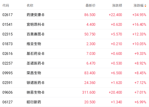 截至午盘,药捷安康-B(02617.HK)涨34.95%、宜明昂科-B(01541.HK)涨16.40%、百赛奥图-B(02315.HK)涨12.33%。