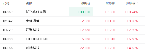 此外,受益于以上利好,光通讯相关个股走强。截至发稿,长飞广纤光缆(06869.HK)涨10.79%、京信通信(02342.HK)涨8.18%、汇聚科技(01729.HK)涨7.89%。