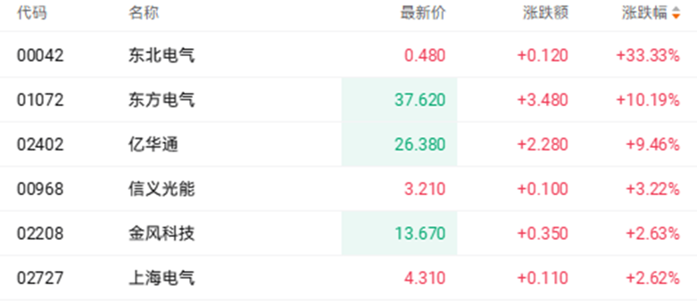 3月4日讯(编辑 胡家荣)港股电力产业链个股显著走强。截至发稿,东北电气(00042.HK)涨33.33%、东方电气(01072.HK)涨10.19%、亿华通(02402.HK)涨9.46%、信义光能(00968.HK)涨3.22%。