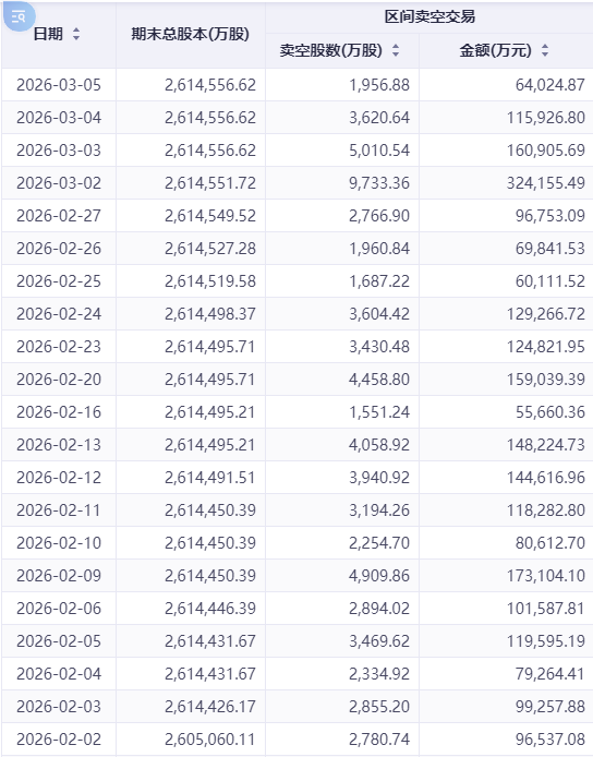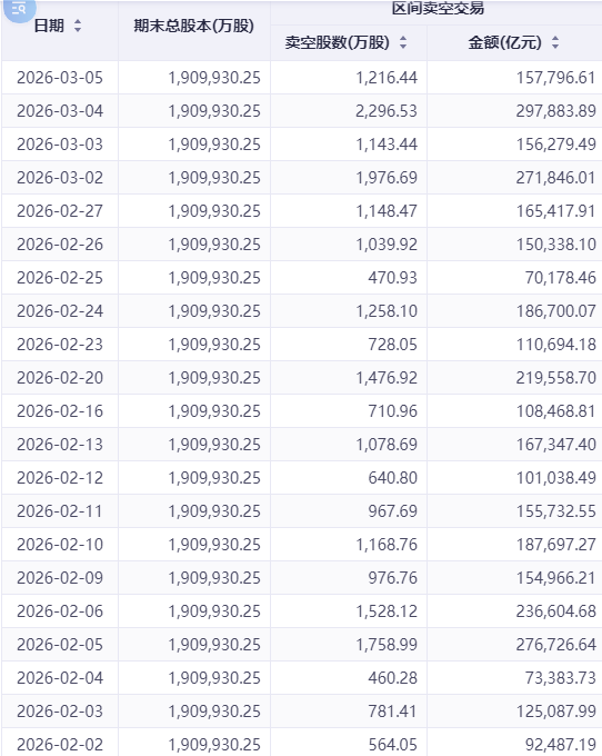 阿里巴巴的卖空股数由2月初的564.05万股快速攀升至3月4日的2296.53万股,卖空金额同步由9.25亿港元增至29.79亿港元。3月4日单日卖空股数创2025年1月15日以来新高。