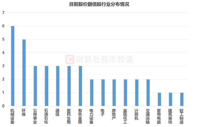 分行业(申万一级)来看,目前股价翻倍的41股中,机械设备、环保股数量相对偏多,分别占比近14.6%、12.2%,同时,公用事业、石油石化、通信股数量也居前。若以细分板块(申万三级)统计,火力发电、通信线缆及配套、IT服务、航运、环保设备、金属制品、其他自动化设备、钨、线缆部件及其他、油气及炼化工程、住宅开发股数量较多。