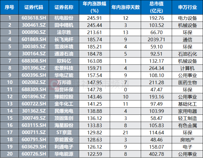 今年以来,市场热点快速轮动,期间涌现多只人气牛股。截至今日收盘,剔除新股数据,累计共有41股年涨幅超100%。其中,杭电股份、田中精机、法尔胜3股年涨幅较高,分别达245.9%、245.4%、213.6%,同时,今日股价创新高的长飞光纤位居全市场A股第4位,雪浪环境、通源石油、欧科亿、宏景科技等股也年涨幅居前。