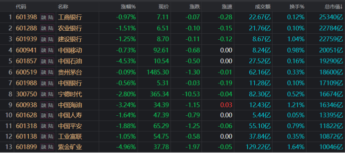 2月13日讯(编辑 梓隆),今日(2月13日),权重大盘表现不佳,截至收盘,上证50指数跌近1.5%,在市场主要规模指数中领跌。其中,万亿市值级的13只“超级大盘股”全线飘绿,尤其是工商银行、农业银行,其两者今日股价齐创近4个月以来新低。
