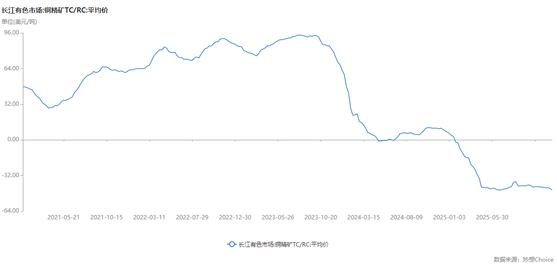 Choice数据显示,2025年1月底以来铜精矿现货加工费一直处于负值,二季度以来,其中TC长期处在-40美元/吨左右。