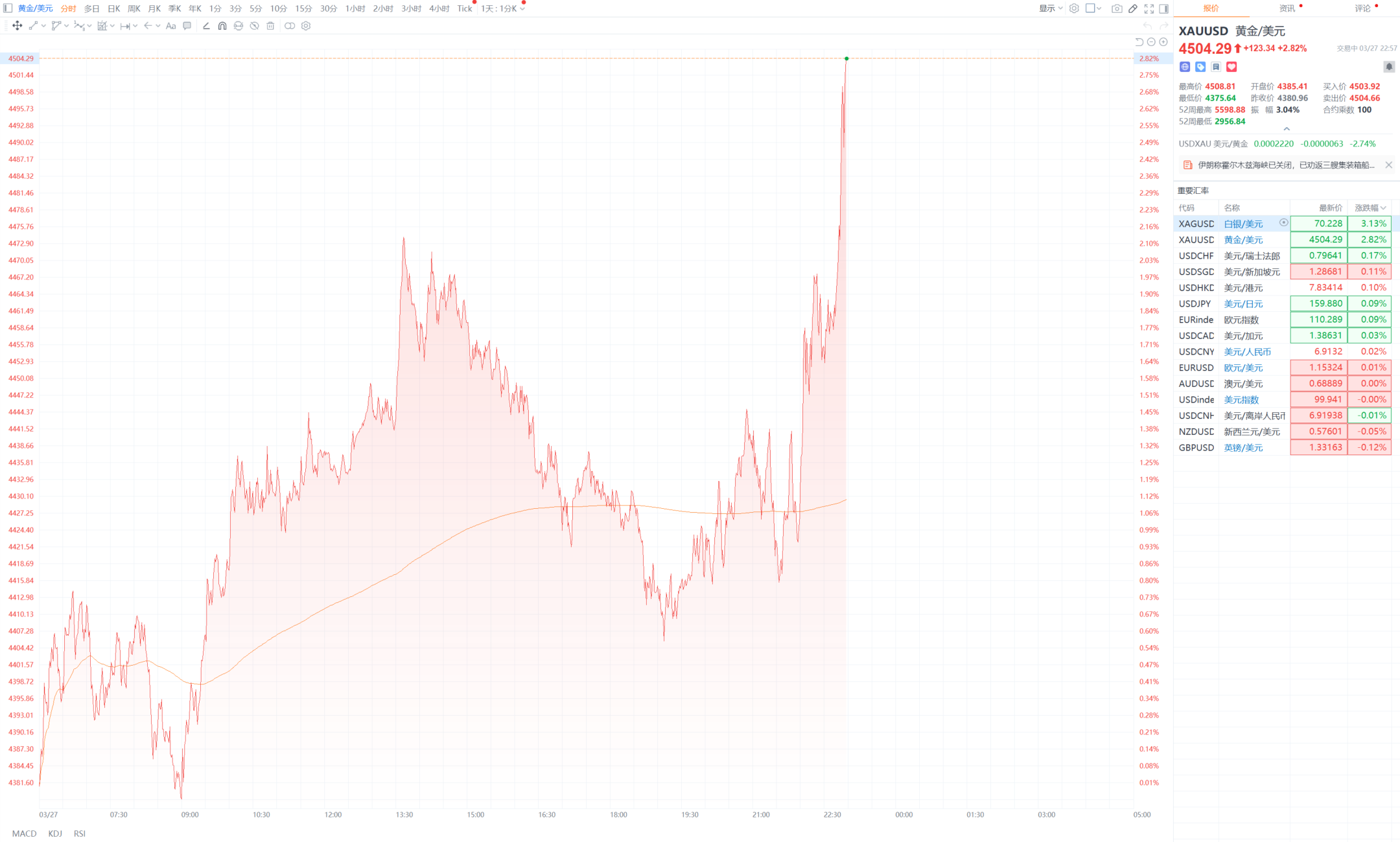 【现货黄金站上4500美元/盎司】财联社3月27日电,现货黄金涨2.85%,报4502.60美元/盎司;现货白银涨2.97%,报69.95美元/盎司。