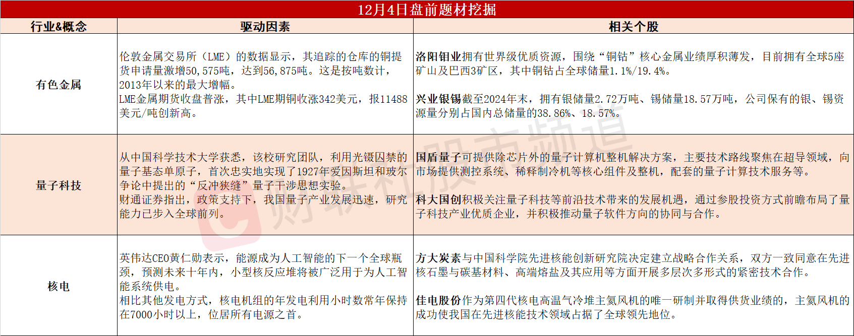 【盘前题材挖掘】①降息预期升温+供应扰动担忧,有色金属板块上行趋势有望持续。②我国科学家取得量子研究新进展,量子领域产业化与工程落地全球领先。③能源成为人工智能的下一个全球瓶颈,小堆核电未来市场前景广阔。