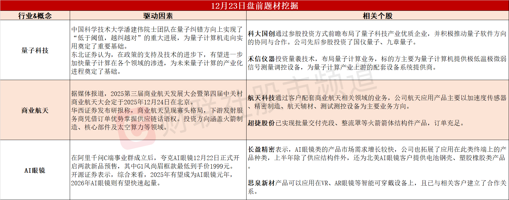 【盘前题材挖掘】①我国量子纠错研究取得重大进展,量子计算产业化又近一步。②2025第三届商业航天发展大会即将召开,商业航天进入密集催化期。③阿里旗下夸克AI眼镜再推两款新品,机构称26年AI眼镜有望快速起量。
