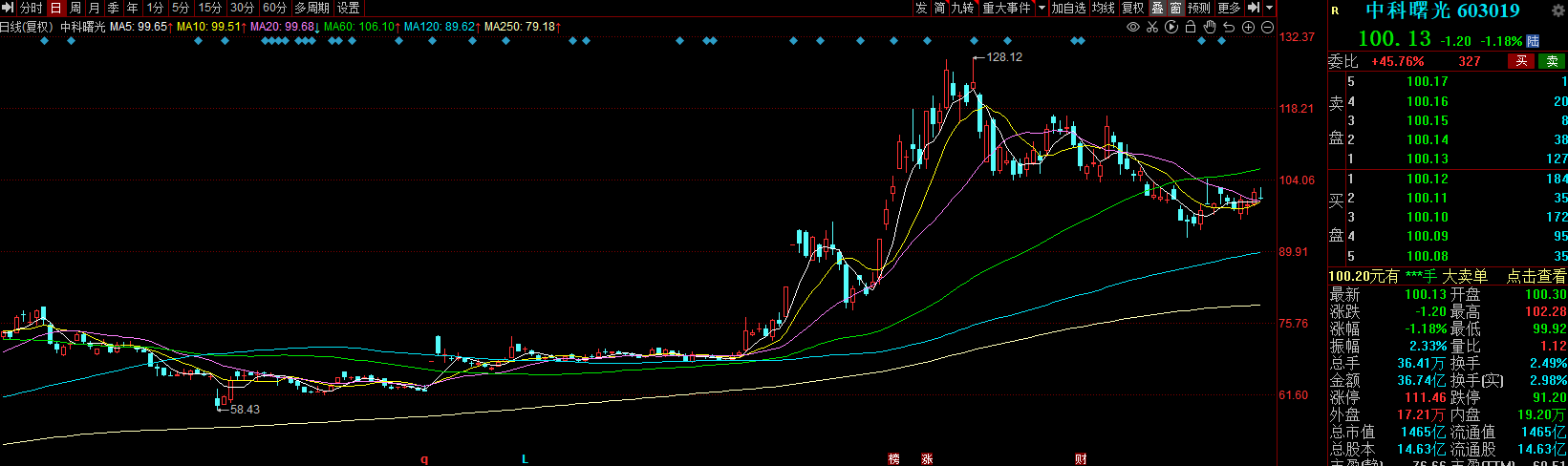 中科曙光复牌当日股价出现一字涨停,并在随后的第三季度期间股价出现大幅拉升,最高价涨至128.12元/股,相较于停牌前股价已翻倍。截至今日收盘,该股报收100.13元/股,总市值为1465亿元。