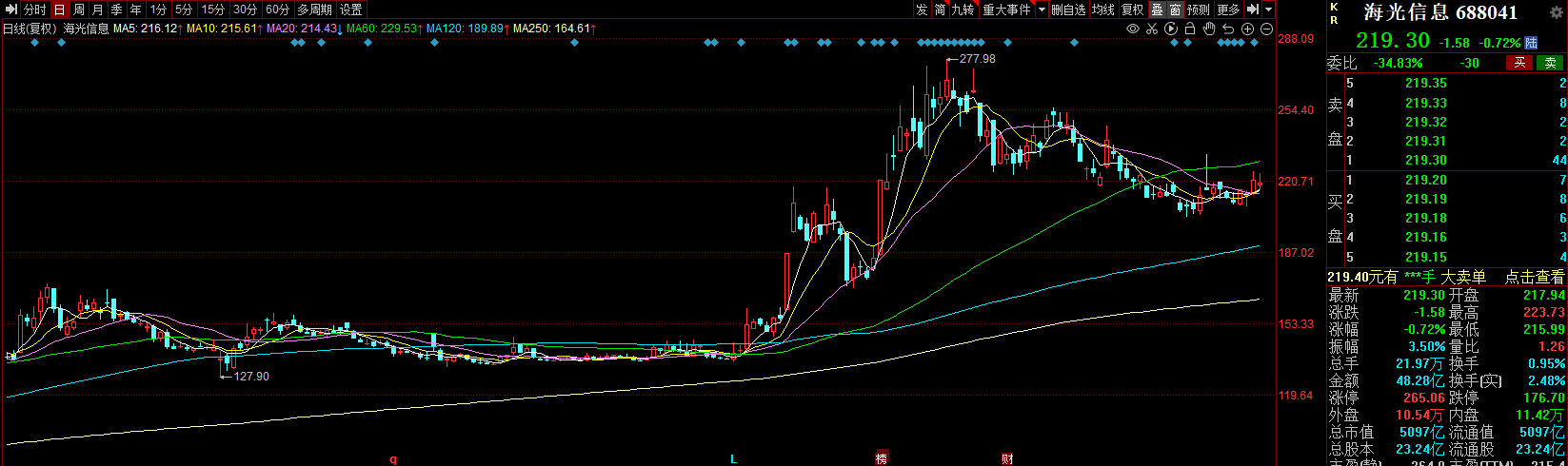 海光信息复牌当日股价也出现大幅高开,随后也在第三季度股价出现大涨,期间最高价277.98元/股相较于停牌前股价同样也已翻倍。截至今日收盘,该股报收219.30元/股,总市值达5097亿元。