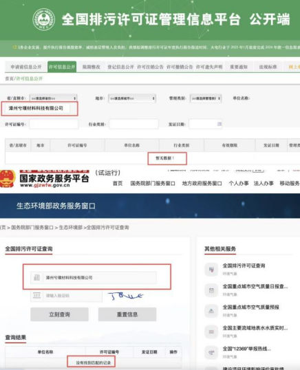 记者分别在全国排污许可证管理信息平台和国家政务服务平台全国排污许可证查询官网以“漳州兮璞材料科技有限公司”这一单位名称进行检索,截至发稿,官网均显示“暂无数据”或“没有找到匹配的记录”。