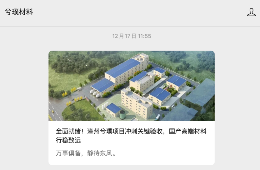 事实上,12月17日,兮璞材料官方微信曾发布《全面就绪!漳州兮璞项目冲刺关键验收,国产高端材料行稳致远》的推文,但随后该推文被删除。这也从另一侧面印证了兮璞材料漳州工厂尚未投产的现状。