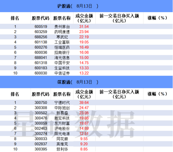 从沪股通前十大成交个股来看,贵州茅台位居首位;药明康德和寒武纪分居二、三位。