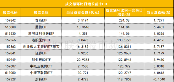 从成交额环比增长前十的ETF来看,券商ETF(159842)成交额环比增长224%位居首位;通信ETF(515880)成交额环比增长144%位居次席。