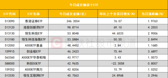 从成交额前十的ETF来看,香港证券ETF(513090)成交额位居首位,港股创新药ETF(513120)成交额位居次席。