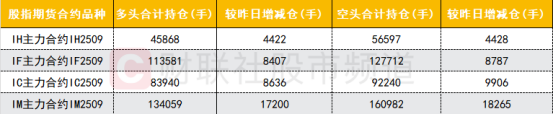 四大期指主力合约多空双方均大幅加仓,IH合约多空双方加仓数量基本相当,IF合约空头加仓数量略多,IC、IM合约空头加仓数量明显大于多头。