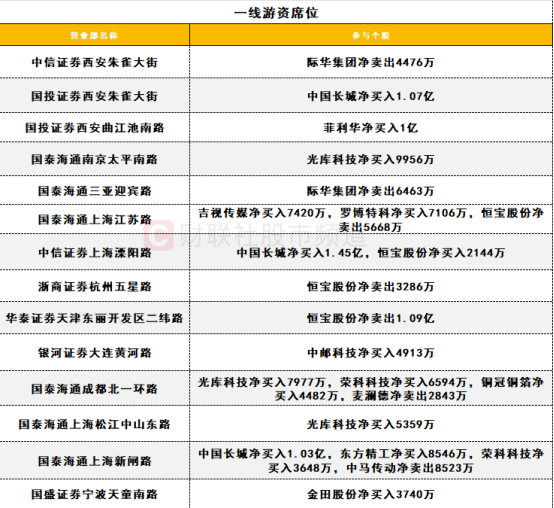 一线游资活跃度一般,中国长城获三家一线游资席位合计买入3.55亿;恒宝股份遭华泰证券天津东丽开发区二纬路营业部净卖出1.09亿;菲利华遭国投证券西安曲江池南路营业部净卖出1亿。